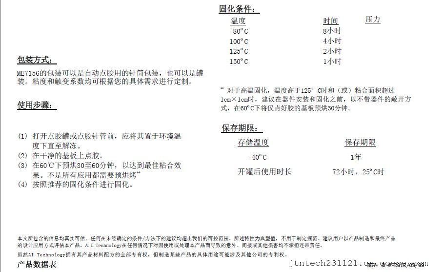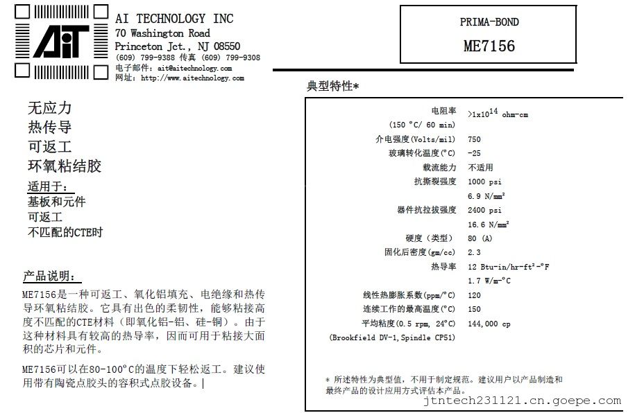 品牌:AiT 型号:ME7156 加工定制:否 包装规格:10CC 固化方式:加热固化 保质期:12 个月 用途范围:导热结构粘接 AiT美国柔性环氧胶低应力可返工环氧胶ME7156